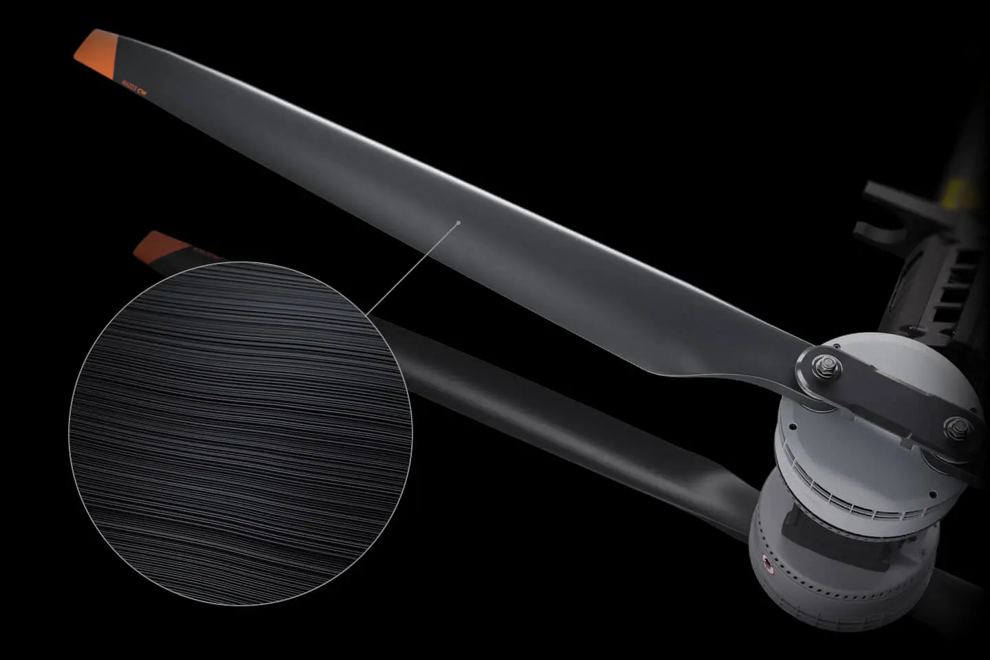 Las hélices de fibra de carbono ofrecen mayor rigidez y menor peso, resistiendo la deformación incluso a altas temperaturas. Con perfil aerodinámico optimizado y diámetro aumentado, la eficiencia se mejora en un 32%
